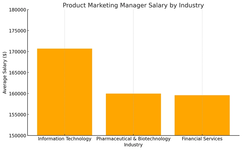 Product Marketing Managers can find the highest average salaries in the Information Technology ($170,691), Pharmaceutical & Biotechnology ($159,964), and Financial Services ($159,599) sectors. These are the industries where the salaries are most lucrative.