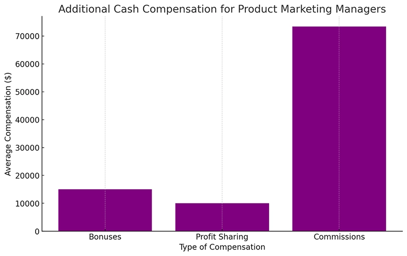 Product Marketing Managers can expect additional compensation in the form of cash bonuses, commissions, and profit sharing, typically ranging from $2,000 to $15,000 for bonuses and adding $1,000 to $10,000 annually for profit sharing.